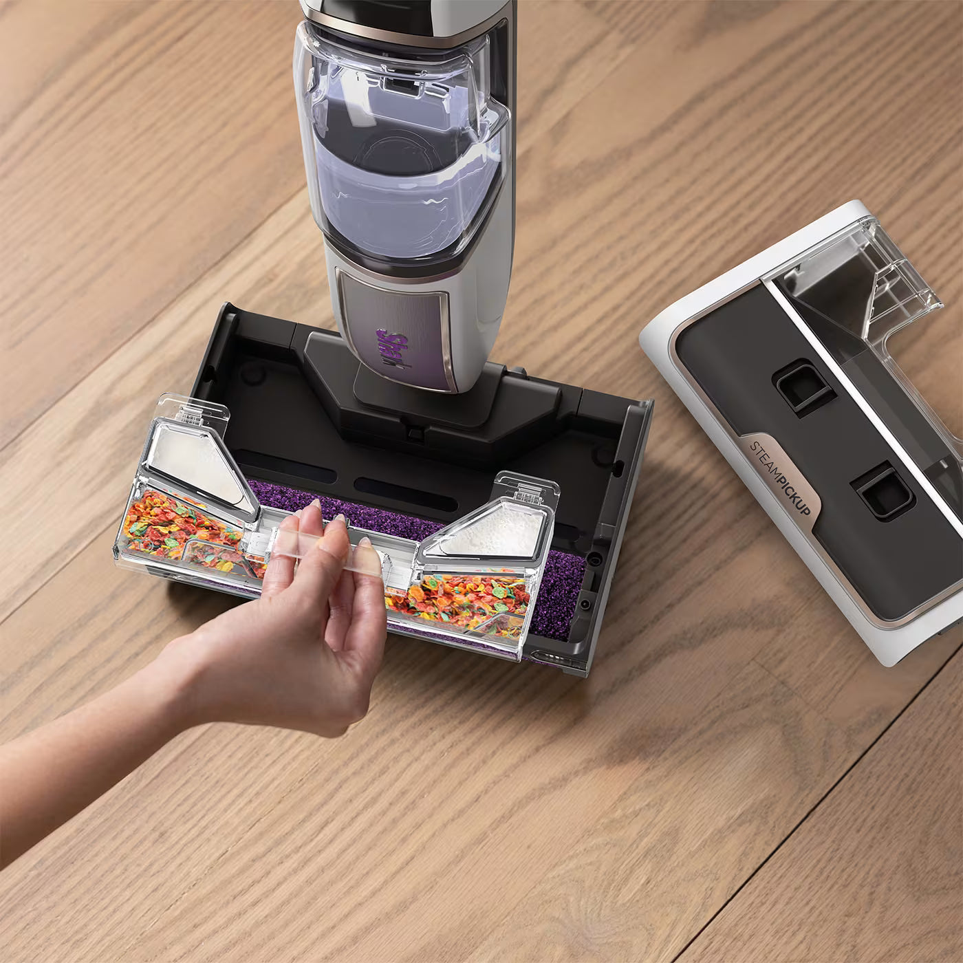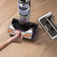 - Patins Rotatifs : Deux têtes rotatives en microfibre frottent jusqu'à 150 tours par minute pour un récurage actif.